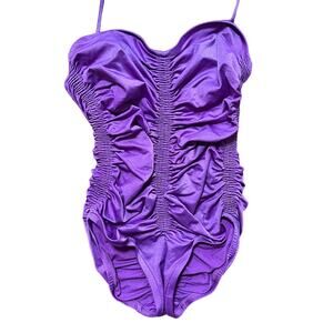 DE WEESE DESIGN VINTAGE Halter Tie Ruched One-Piece Swimsuit Bathing Suit in Solid Purple