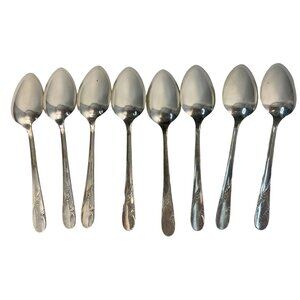 Elevate your dining experience with this elegant set of 8 vintage silverplate spoons by Oneida. Featuring a refined floral design, these spoons add timeless charm to any table setting.