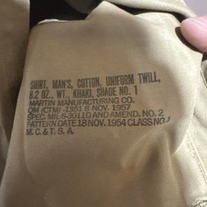 This vintage US Army uniform shirt from the 50s is a true collector's item. Made from a durable cotton twill fabric in a classic tan color, this shirt features a collared neckline, long sleeves with button cuffs, and a button-down closure. The solid pattern and simple accents make it a timeless piece that can be worn for casual occasions all year round.