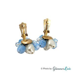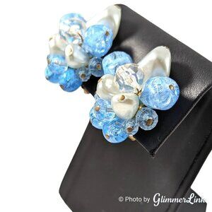 VTG 50's W Germany Blue & Gray Lucite Faux Pearl Beaded Cluster Clip On Earrings