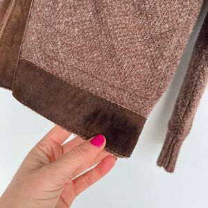 This vintage Traverse Bay Woolens jacket from Traverse City, MI features genuine leather suede trim, dense textured acrylic knit, and all-metal TALON zippers and pulls — an easy way to date it to the 1950s–60s era. It has that rugged, outdoorsy charm you see in old hunting and cabin jackets, but with softer, surprisingly wearable knit fabric.