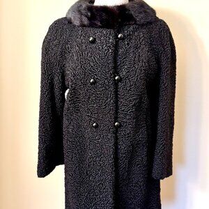 Embrace the timeless elegance of the VTG 50s/60s Winter Black Lambswool Jacket, a garment that radiates classic style with every detail. Fashioned from luxurious Persian lamb fabric, this swing coat boasts a rich black color complemented by a sophisticated satin lining. The 3/4 sleeves and fur-trimmed collar add a touch of glamour, making it an ideal choice for formal occasions or elegant parties. The jacket features a varied pattern that lends an exclusive look to the piece, while the button closure ensures a seamless fit. Tailored to fit a small to medium size, the coat offers a classic fit that flatters the silhouette. Perfect for fall, spring, or winter wear, this vintage treasure is a stunning addition to any wardrobe.