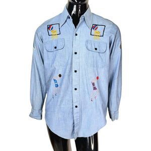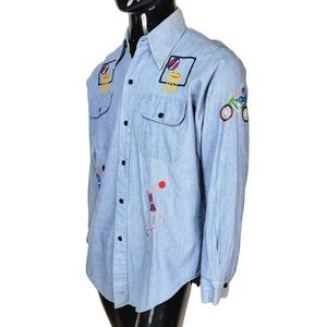 keywords: Vintage, Unisex, 60s, sports, sporty, gender neutral, dagger collar, button-down, workwear, hand embroidered, 70s, fun, patchwork, men's, rare, hard to find, OOAK, unique, vintage upcycle, chainstitch,