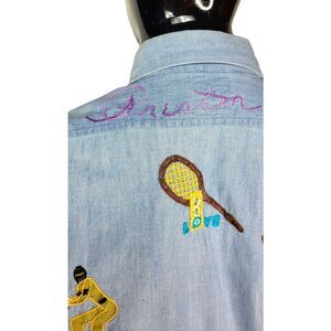 Vintage 60s 70s CR Anthony Co BUCKHIDE men's blue button-down work shirt, button-down pockets at the chest, dagger collar, hand embroidered with various sports basketball, penny-farthing, bicycling, baseball, tennis, and football, with players, and the name Preston is on the back, size is marked 15.5 fits a modern medium large depending on your measurements and desired fit.