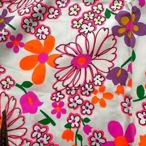 This is an AWESOME and BRIGHT floral pattern from the 1970s or 1960s. Reminds me of the bold colors and prints from marimekko. Shades of pink, orange, purple and green on this hippie psychedellic inspired woven fabric. 100% cotton. Seems to be in excellent condition!