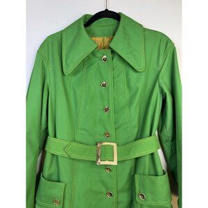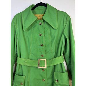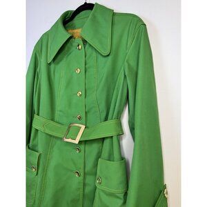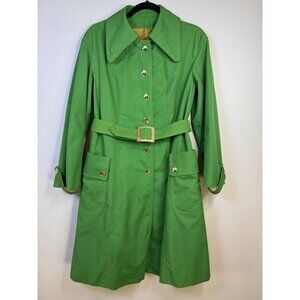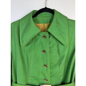 VTG 60s 70s Miss Gallery Belted Trench Swing Coat Gold Button Cuffs Green Sz L