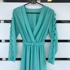 You will look amazing in this retro one of a kind 60’s / 70’s handmade maxi dress with arm cutouts, deep plunge faux wrap front bodice and matching belt in a beautiful teal color. Can be worn with or without belt. Very flowing and flattering. Vintage piece from the 60s 70s Mid Century Modern era.