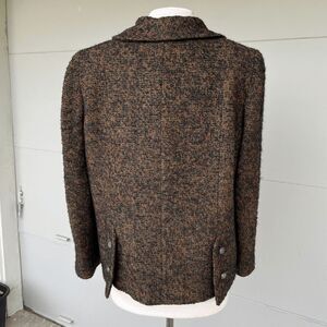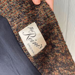 VTG Abe Reinis Original textured tweed short coat, union-made in the U.S.A. under the ACWA (Amalgamated Clothing Workers of America). Beautifully tailored from a heathered tweed blend (feels like wool) in rich tones of green, rust, orange, and black. Soft structure through the shoulders, notched collar, full lining, and decorative back button tabs for a refined finish.
