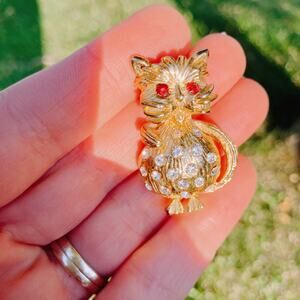 Features: Textured gold tone figural cat with dimensional fur; red rhinestone eyes; clear rhinestone-studded body; rollover safety clasp