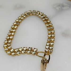 This rhinestone bracelet (I believe this is a Weiss bracelet - unmarked)features gold tone metal with a double strand of sparkling clear rhinestones - facet set.
