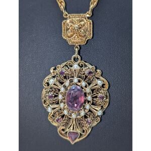 VTG 60's Gold Tone Faux Pearl Amethyst Color Rhinestone Pendant 22" Necklace