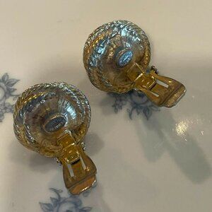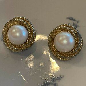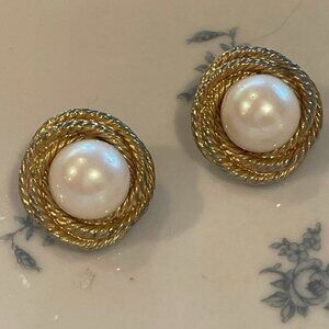 Hard to Find Vintage 1960s Signed Early Kenneth Lane Classic Circular Gold-Plated Twisted Rope Faux Pearl Clip On Earrings.
