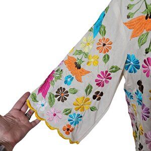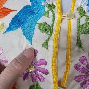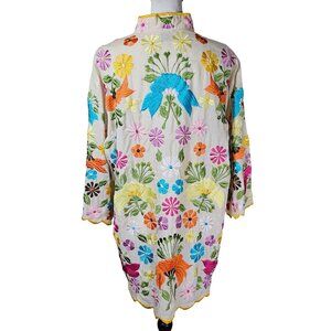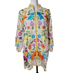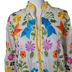 Lightweight tunic-style jacket featuring gorgeous vibrant floral embroidery, three-quarter sleeves, and front hook closures. Ideal for layering or breezy weather.