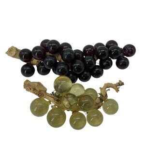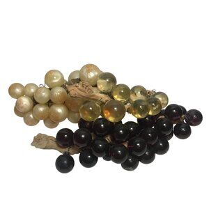 Enhance your interior decor with these vintage Lucite grape clusters, featuring elegant dark purple and light amber tones. Perfect for adding a touch of classic charm to any room, these decorative pieces are crafted from Lucite and wood, offering a timeless appeal. Their realistic design complements various styles, from modern to vintage.