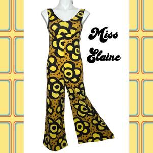 Rare and striking vintage 1960s jumpsuit by Miss Elaine. Features a bold oversized mod floral print in mustard yellow, lemon, and black. Sleeveless with a V-neckline, scoop back, and wide legs. Built-in structured bra interior with elastic support strap. A unique and high-quality example of 60s mod fashion — perfect for collectors, retro lovers, or standout summer style.