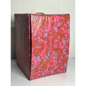 Vintage 1960s mod-style wig storage box with pink and blue floral vinyl design. Includes wig stand, Perfect for display, storage, or retro décor.