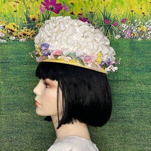 Gorgeous Floral and White Cellophane Straw Hat with so much character! She's from Sears Roebuck and Co. U.S.A. in the 60s. Exterior of the hat is in excellent condition with no flaws from what I can tell. The interior yellow velvet lining only shows light signs of normal wear for its age with a few very small spots. Tag is still in tact and attached. Inner circumference is 20 1/4" and hat stands about 4" tall. Thank you for stopping by Lucy and Ethel's Vanity!