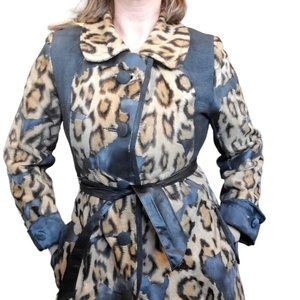 VTG 60s Small Faux Fur Leather Animal Print Leopard Statement Trench Jacket Coat