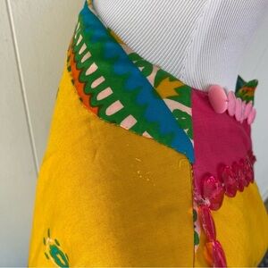 This VTG 60s Top Cape Hippie Yellow colorful vibrant Hawaiian Cotton Tunic is a handmade vintage piece perfect for a party occasion. The tunic's mod/go-go look and vibrant multi-color design are reminiscent of the 1960s era. Made from comfortable cotton material, this one-size top exudes a unique boho style that would make a statement in any wardrobe. Its original design and post-WWII-early 60s era add a touch of nostalgia and character to this eye-catching piece.