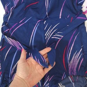 Shiny navy blue with groovy prints, in purple, pink & white. V- dipped neckline. High waist, with side ties, to adjust fit, from the front- giving it a cute stylish & slimming look. Slightly molded, unpadded & wireless, shelf bra (from the 60s, will need some shaping). Elastic, stretch leg openings, boyshort vntg cut. Inner front crotch lining. Made from Antron nylon & Lyrica spandex. Machine wash cold; Hang dry