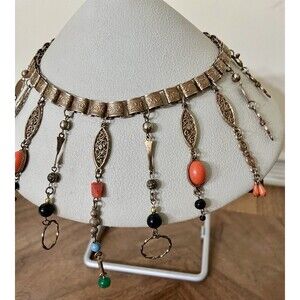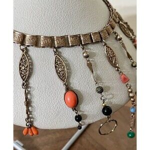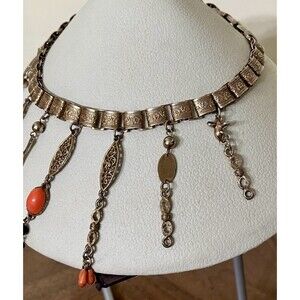 The VTG 60s Victorian Revival Gold Tone Graduated Charm Choker Necklace Regency is a vintage piece from the 1960s with a Victorian revival style. It features a choker style with a hook closure and a beautiful orange main stone in a round shape. The necklace has a unique design with oval and diamond-shaped pendants, adding to its charm. This piece is perfect for various occasions such as weddings, anniversaries, birthdays, and special holidays like Christmas and Valentine's Day, making it a versatile and stylish accessory for any jewelry collection.