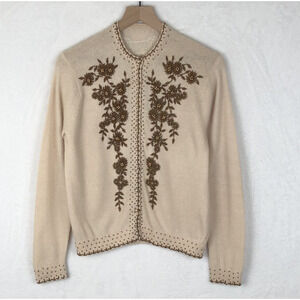 This gorgeous vintage wool beaded cardigan sweater in size Medium (no size tag, see measurements) features a beige color with pearl buttons and a long sleeve silhouette, making it suitable for many occasion. The beaded look adds a unique touch to this original piece, crafted from high-quality wool material.