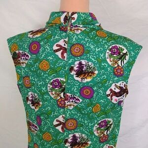 Sleeveless, with a top mock neckline, which can fold over or worn up. Bright green, with lime green, green, yellow, & purple floral prints. Along with brown eagles, mountains & a japanese look lettering print. Keyhole, eye/ hook, closure, on back, with the hidden lime green Talon zipper closure, that goes down about mid length. Feels like a polyester- nylon, with a butter soft feel. Has lots of stretch.