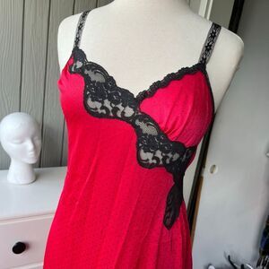 Vintage late 1970s–early 1980s Vanity Fair full-length red nightgown with striking black lace trim and a dramatic side slit. Made in the USA of sheer nylon with a subtle dotted texture and flowing drape. Features lace insets along the bust and hip, adjustable lace straps (replaced but functional), and a high slit for ease of movement and allure. A romantic collectible lingerie piece that also styles beautifully as a slip dress under a blazer or cozy cardigan.