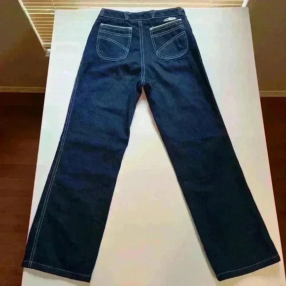 Vintage 70s Bill Blass Womens Piping Skate Slight Flare Casual Utility Distressed Flare Boot Cut Carpenter Denim Blue Jeans Size 27” Waist