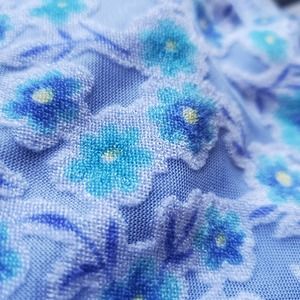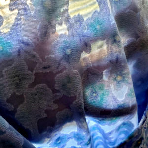 This is a vintage hand made cardigan blouse. It is made of a mesh fabric with a small blue floral pattern all over. The front has one button closure. There are two pockets near the waistline. Overall condition is great. This seems to be a handmade item it has no tags.