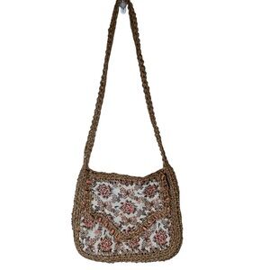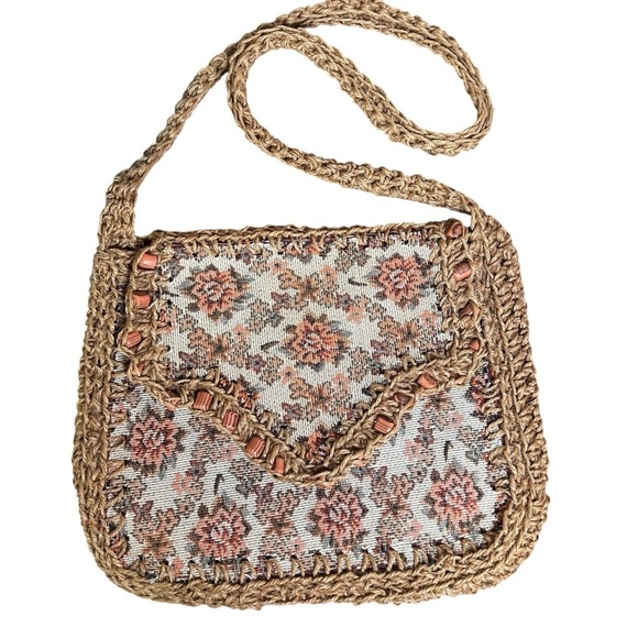 Crafted in Hong Kong, this boho-style purse features a beautiful floral tapestry body with a woven raffia (twine?) border and strap, plus unique beaded trim on the flap. The interior is lined in marbled red vinyl for durability. Perfect for summer festivals, casual outings, or as a collectible vintage accessory.