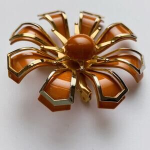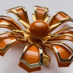 VTG 70s Brooch Orange Auburn Enamel Dimensional Flower Gold Tone Metal Pin