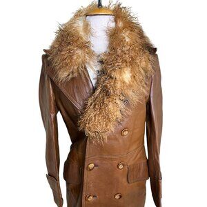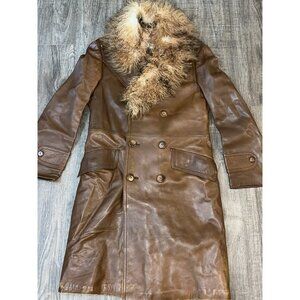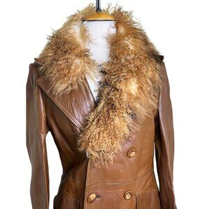 VTG 70s Brown Long Leather Spy Trench Coat Fur Collar Hippie Disco Retro M SPAIN