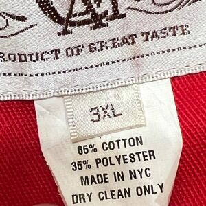 Eye-catching short-sleeve button-up shirt from CAVI Product of Great Taste. The unique military-inspired design features vibrant red fabric, epaulets, decorative patches, and gold-tone buttons engraved with the CAVI logo. Details include two chest pockets, each adorned with a gold-tone button and additional military-style embellishments. "Product of Great Taste" is printed on the inside of the collar. This 3XL shirt, made in NYC, is a distinctive piece that commands attention.