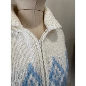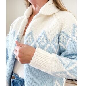 VTG 70s Cowichan Knitted Sweater Cardigan Snow White BlueWestern Cowboy Large