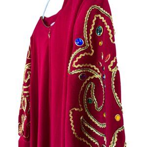 This vintage David Brown for Saks maxi house dress / dressing gown, features intricate gold beading and vibrant multicolor gem accents on the sleeves. Made of soft cotton-polyester, the dress exudes elegance and sophistication, ideal for relaxing in luxury. Its flowing silhouette and practical pockets add functionality to its stunning design.
