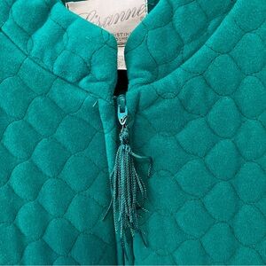 Green velour robe. Quilted top. 3/4 zip with tassel pull. This does not have a size or material tag-so the size is an estimate based on measurements. One light area of wear as shown in photos.