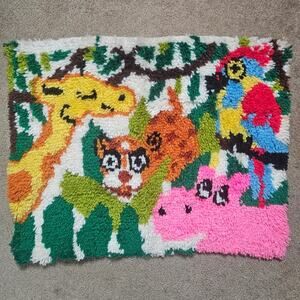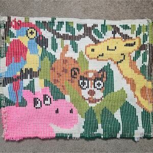 VTG 70s Latch Hook Rug, Jungle Animals: Giraffe, Parrot, Hippo, & Cheetah, 21x26