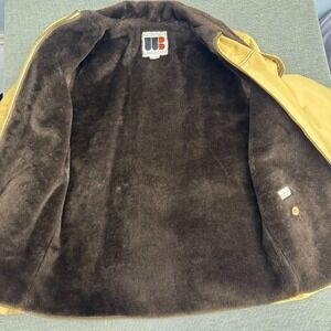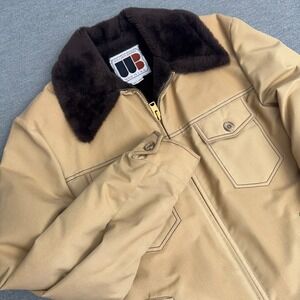 Vintage 70s William Barry Men 40 Medium Streetwear Tan Brown Barn Jacket Full Zip Front Pockets Faux Fur Lined Western Made in USA MOD Hipster Grunge