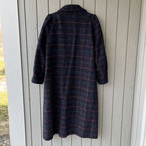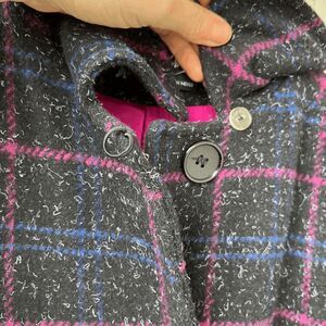 This is one of those coats that looks like it walked straight out of a 1970s department store window — impeccably made, structured, a little dramatic, and absolutely fun to style. The wool-blend exterior features a textured gray base with blue and magenta plaid striping, but the real moment is the electric pink lining that flashes when you move. It feels very Harry Burns meets Jackie O — classic with a wink.