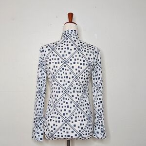 VTG 70s Montgomery Ward Blue and White Geometric Print Tie Neck Blouse Size 10