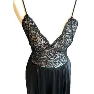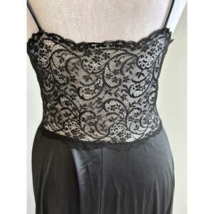 This VTG 70s Nightgown is a glamorous and whimsical piece with a black lace bodice and long, flowy silhouette. It exudes a romantic and gothic vibe, perfect for those who enjoy vintage-inspired intimates. The gown features a sleeveless design, V-neckline, and is made of nylon and lace fabric. It has Hollywood glam accents and a lace corsette detail, making it a standout choice for any wardrobe. Made in the USA by the brand Vassarette, this gown is a unique and stylish addition to any collection of sleepwear or loungewear.