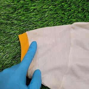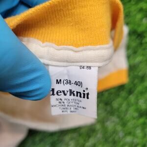 Vintage 70s Norwalk HS marching band ringer tee DevKnit USA 50/50 paper thin yellow white single stitch slim fit XS long.