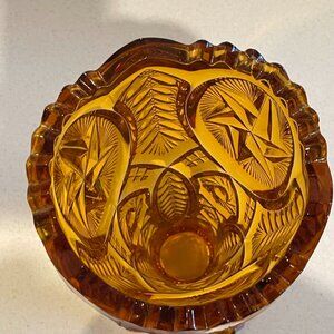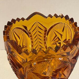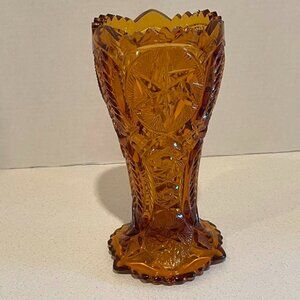 Vintage 70s Ohio Star Deep Amber Color Glass Footed Vase w/ Sawtooth Rim.
