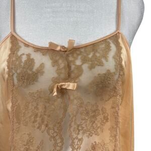 VTG 70s Open Front Baby Doll Camisole Sz M Satin Nylon Beige Lace Lingerie Sexy