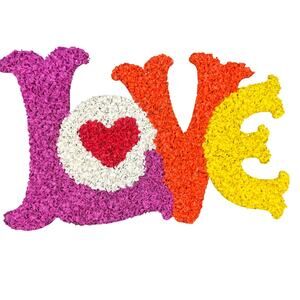 Colorful 3D textured plastic design, mid-century mod typography, heart center motif, iconic “LOVE” design, lightweight wall décor, retro Valentine theme
