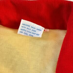 A true retro gem — this vintage 1970s Queens Way to Fashion polo shirt captures the era’s love of bright color, bold contrast, and fitted silhouettes. Done in a soft butter yellow with colorblock accents in red, blue, and teal, it features a classic mod-inspired collar and matching trim on the pocket and side stripes.