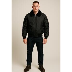 This vintage Sears Work Outerwear bomber jacket in size XL (46–48) is a timeless piece of classic workwear style. Made in Korea, it features a durable black nylon shell, quilted orange lining, and a soft faux fur collar for added warmth. The jacket has a full front zip, ribbed cuffs and waistband, and two front hand pockets. A great retro jacket with military and workwear influence, perfect for collectors or anyone who loves vintage outerwear. In good preowned condition with normal signs of wear consistent with age. Please review photos for details and measurements.