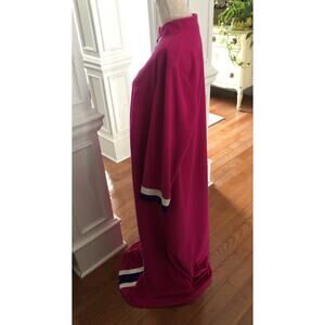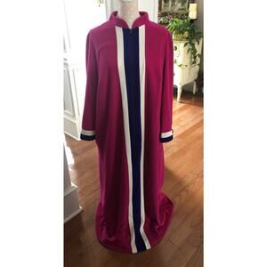 This vintage Vanity Fair housecoat is a 70's style kimono robe in hot pink and purple color block design. Made of polyester fleece, it features a mock neck, long sleeves, and a zip front closure. The lightweight robe has a striped pattern with accent zippers and a length of 54 inches. Perfect for a retro, grandma chic look.