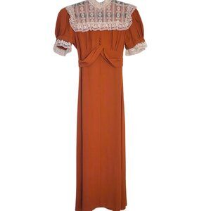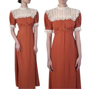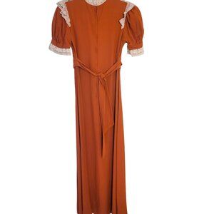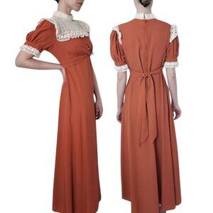 70s does Victorian style short sleeve maxi length prairie dress, cinnamon/burnt orange color